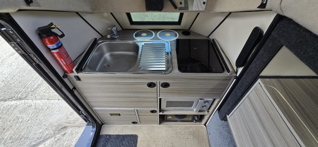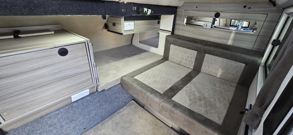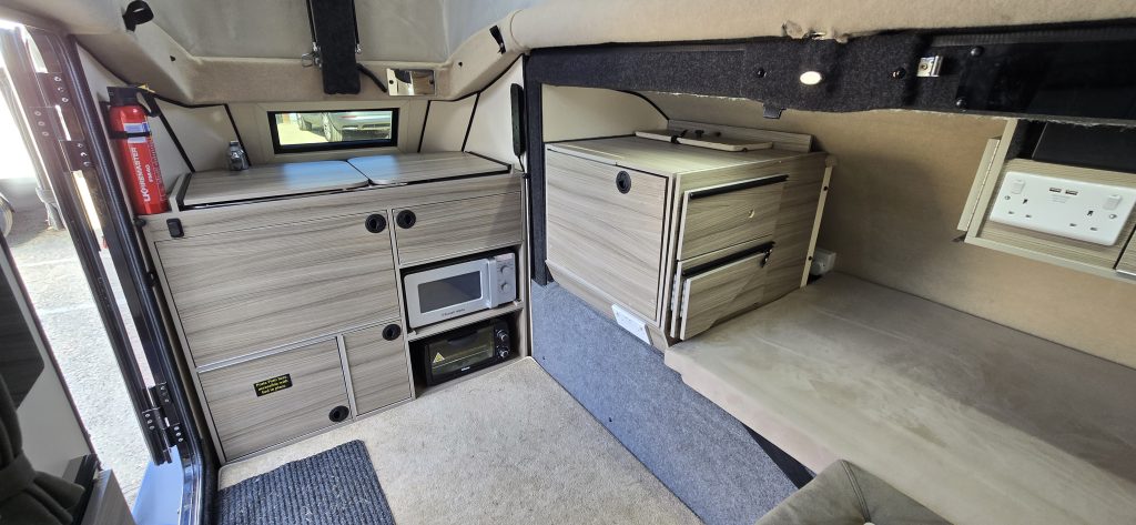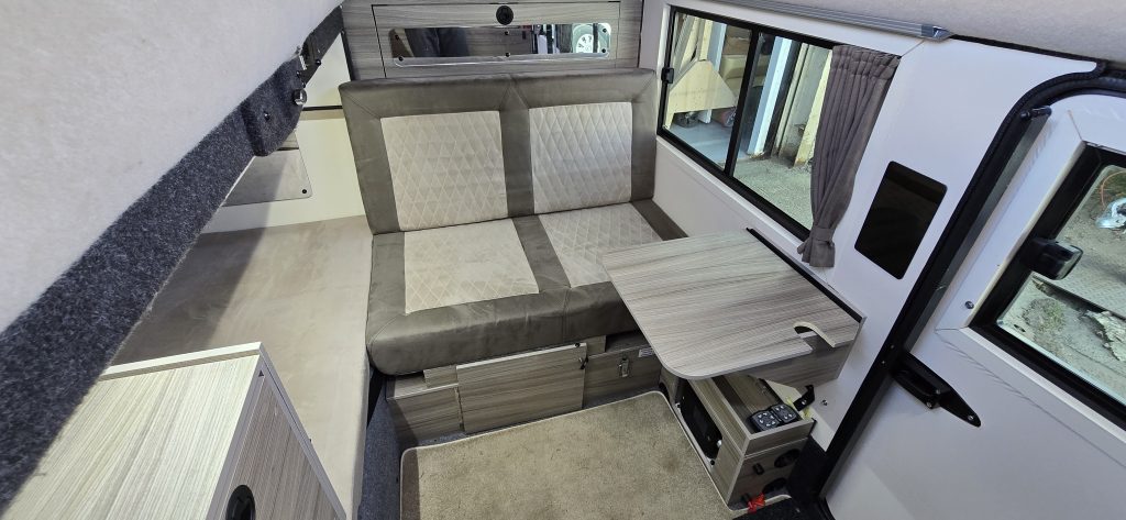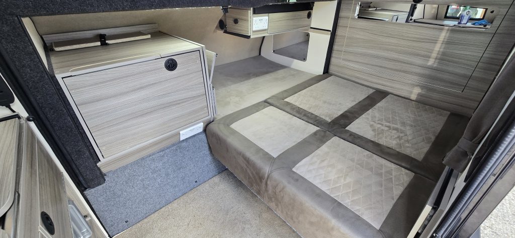 Double bed or make up as one single. Solar panels on the roof, podrant and back end add up to approx 600watts. 6kWh Lithium batteries. 3,000 watt inverter so we can use the hob, microwave and hob all at the same time and for multiple days off-grid.