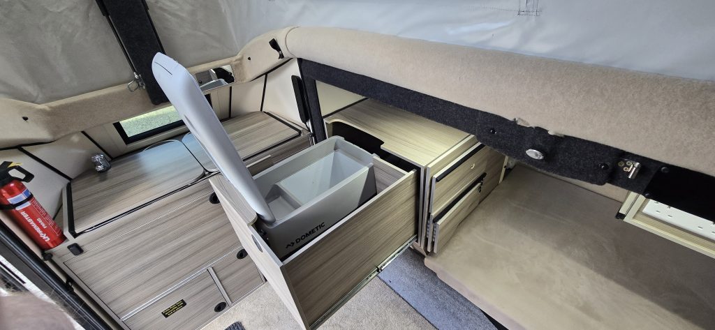 Porta Potti and fridge access even with beds in place. Tow with small petrol, diesel or electric car.